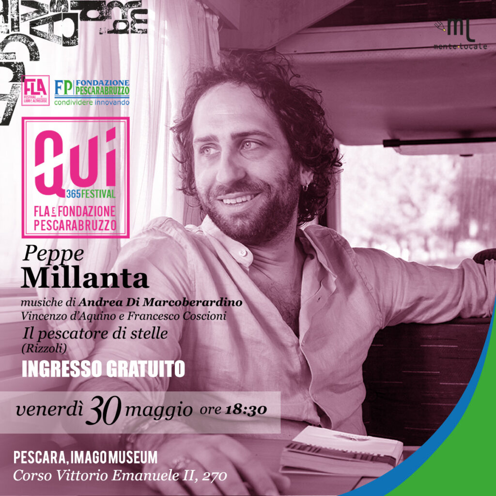 Peppe Millanta, autore degli amatissimi “Vinpeel degli orizzonti” e “Cronache da Dinterbild“, porta a Qui – 365 festival il suo nuovo libro “Il pescatore di stelle” (Rizzoli). E lo fa a modo suo: un incontro a tre voci che sarà anche un reading, accompagnato dalle musiche di Andrea Di Marcoberardino.